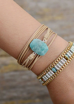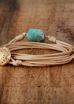 The bracelet is crafted from supple, durable leather cord, offering optimal comfort while adding a boho, artisanal aesthetic to the whole. The rope creates a strong, durable structure, ensuring a secure hold of the bracelet around your wrist. At the center of the bracelet is a natural stone, carefully selected for its beauty, color and unique properties, which adds a captivating visual dimension and a connection with nature. The design with natural stone on the front creates a captivating focal point. Versatile and easy to match, this Boho Cuff Bracelet is suitable for all styles and occasions. Wear it alone for a casual, boho look, or pair it with other bracelets for a bolder, more personalized style. Order now and you'll be delighted by the way this bracelet adds a sense of character and connection with nature to your look.