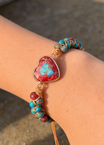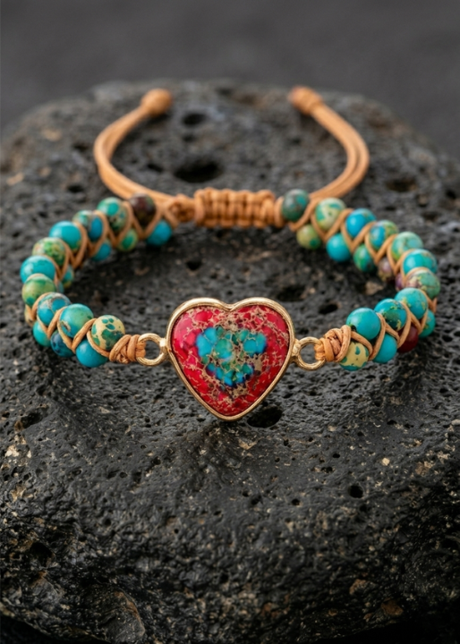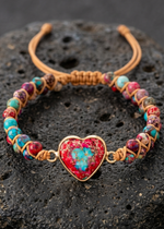 These unique boho heart bracelets capture the boho spirit while symbolizing the love and deep connection between friends. Each bracelet is carefully crafted using high-quality blue and red imperial jasper beads. Imperial jasper is a gemstone renowned for its deep blue and rich red hues, adding a touch of vibrant beauty and inner strength to your wrist.