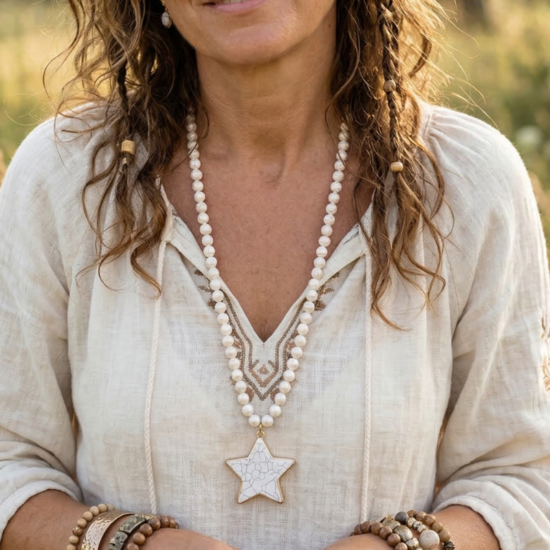 Add a touch of bohemian elegance to your look with the Boho Necklace Star Pendant, featuring radiant natural stone beads and a charming star pendant that symbolizes hope, beauty, and feminine energy. Its versatile long design lets you wear it alone for a relaxed boho vibe or layer it with other pieces to create a stylish and personalized statement.