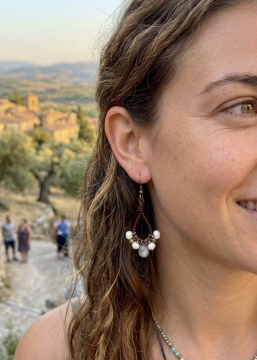 Each pair of boho earrings is carefully crafted, highlighting the natural beauty of labradorite. The earrings feature a delicate, resistant cord that adds a touch of lightness to your look. Pearls are arranged along the cord, creating a subtle, refined pattern. Labradorite, meanwhile, is a gemstone with shimmering reflections that add a touch of mystery and sophistication.