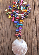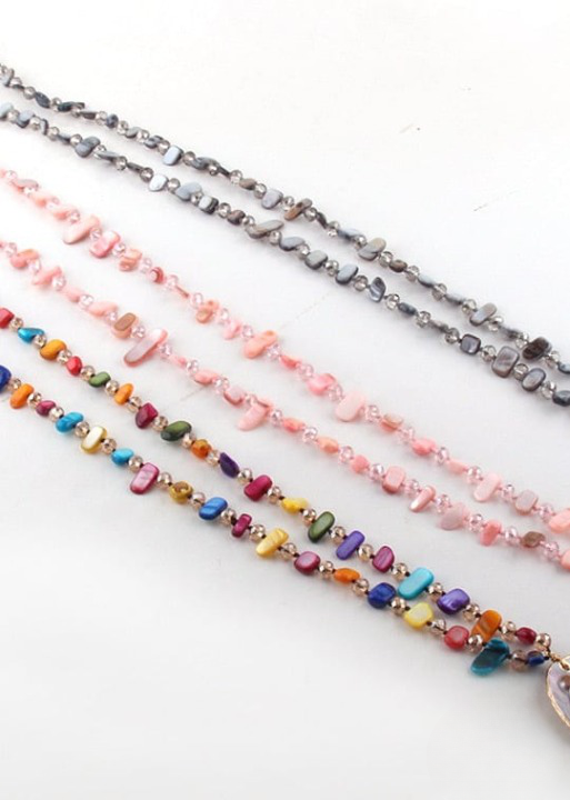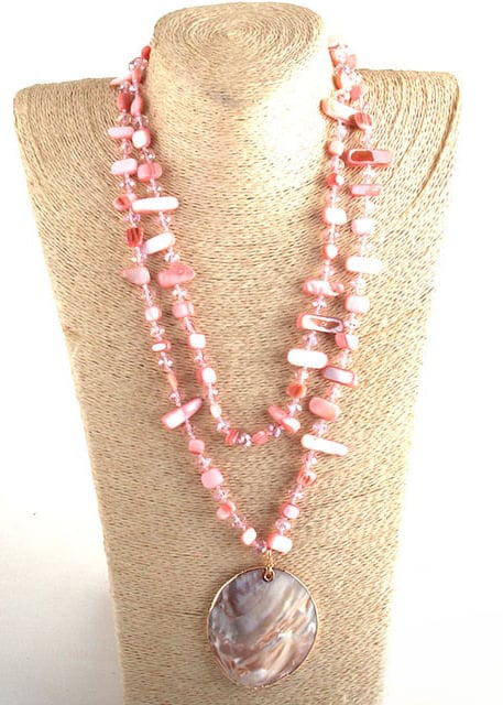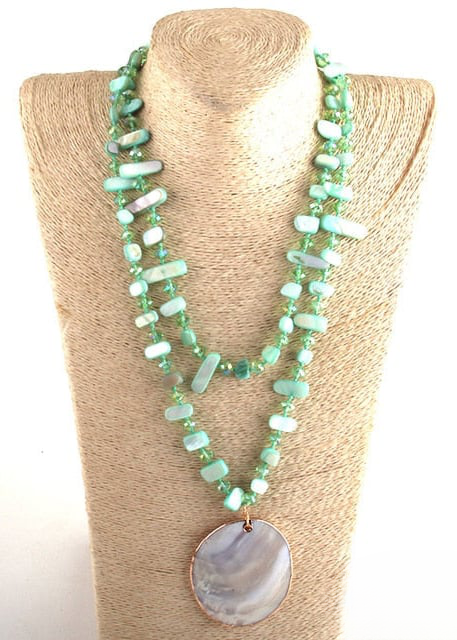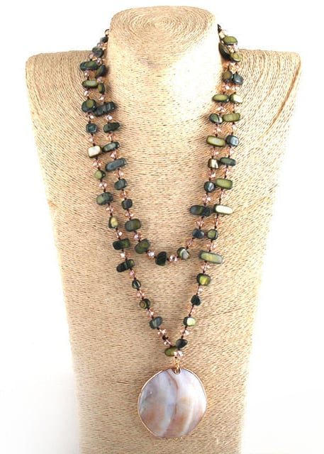 This necklace is a true jewel of nature, showcasing the beauty of natural stones. The elongated stones are carefully selected for their unique shapes and varied colors. They add an interesting dimension and texture to the necklace, creating a visually appealing effect. Round pearls add a touch of delicacy and sophistication to the necklace. They are harmoniously arranged between the elongated stones, creating a subtle yet elegant contrast. The circular shell pendant is reminiscent of the ocean and nature, bringing a fresh, feminine touch to the whole necklace. Whether for a special occasion or casual wear, this necklace will bring a touch of natural beauty and elegance to your look. Treat yourself or someone special to this beautiful Boho Vintage Necklace 2 Layers, and let the beauty of nature shine around you.