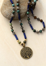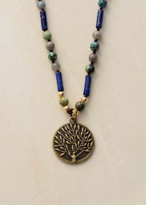The natural stones used in this necklace are carefully selected for their color, brilliance and quality. Round stones add a touch of softness and balance, while elongated stones add a unique, modern dimension. The round metal pendant is adorned with a detailed engraving of a tree, symbolizing strength, growth and connection with nature. This engraving adds a meaningful, artistic touch to the necklace, making it even more special. The necklace is made from high-quality materials to ensure durability and longevity. The chain is adjustable to suit different lengths, allowing you to adjust it to suit your preference and outfit. This versatile necklace can be worn everyday or for special occasions. It adds a touch of natural, sophisticated style to any outfit.