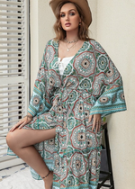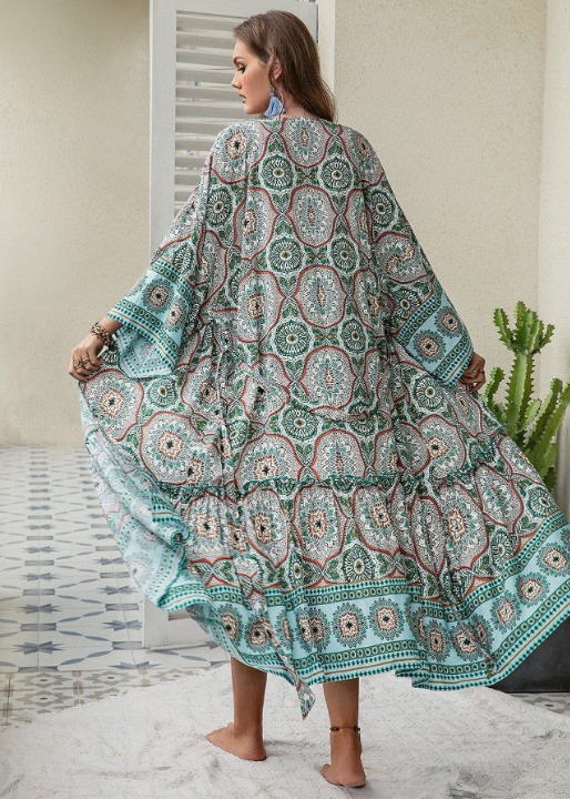 Our boho tribal print plus size long kimono is the perfect choice to add a touch of boho chic to your wardrobe. This gorgeous kimono features a bold tribal print in shades of green that creates a sense of natural beauty and grace. Made from high-quality materials, this kimono is designed to keep you comfortable and stylish throughout the day. Its loose, flowing design is perfect for layering with your favorite tops and dresses, while the lightweight, breathable fabric ensures maximum comfort. With its boho chic style, our large size boho tribal print long kimono is the perfect choice for any occasion, whether you're dressing for a special event or just looking to elevate your everyday style. Don't wait, add this beautiful and versatile kimono to your collection today and discover the perfect blend of style and comfort!