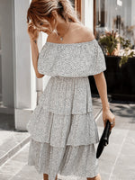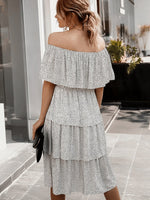 • Details : long mid-calf dress, cascading ruffles, frills, elastic waist