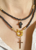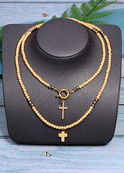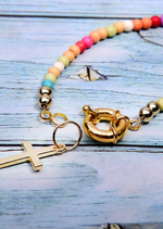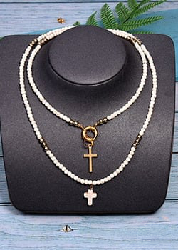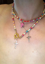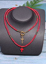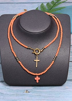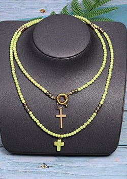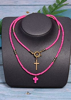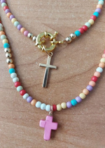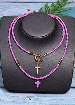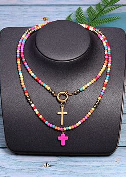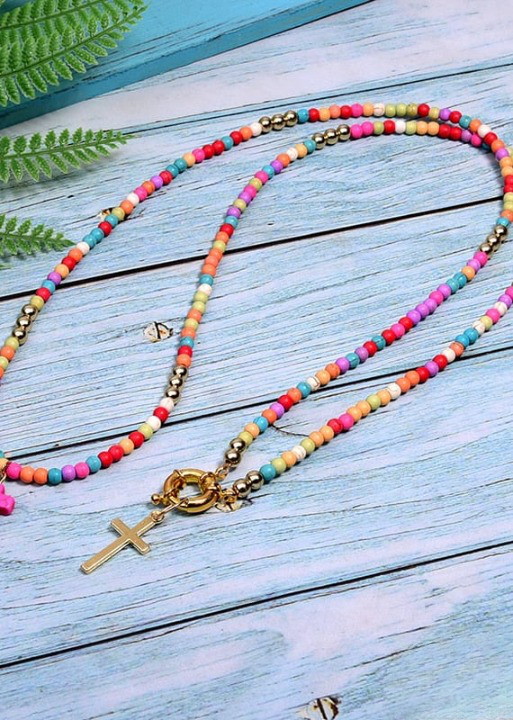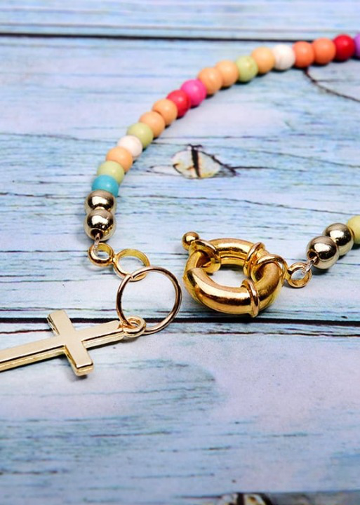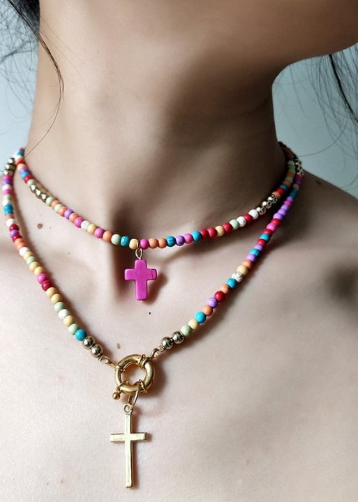 This necklace is made up of beads in a variety of bright colors, creating a dynamic, eye-catching look. The multicolored pearls used in this necklace are carefully selected for their quality and brilliance. Each pearl is polished to reveal its vibrant color and smooth appearance, adding a touch of luminosity to the overall necklace. The cross pendant adds spiritual significance to this necklace. The cross is a universally recognized symbol of faith, hope and protection. It represents spiritual connection and belief in something greater than oneself. This necklace is perfect for expressing your personal style and spirituality. Made with care and attention to detail, order now and add a touch of color, style and spirituality to your jewelry collection.