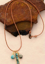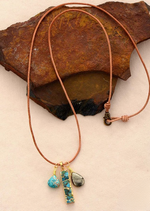 The first pendant is an oval pyrite that shimmers with radiance. Its metallic sparkle adds a touch of sophistication and glamour to the ensemble. The second pendant is an oval turquoise, famous for its soothing blue-green color and unique natural texture. This natural stone adds a touch of freshness and calm to your look. The third pendant is a rectangle turquoise, offering an elongated shape that brings a modern, elegant aesthetic. Its vibrant color adds a lively, dynamic touch to your style. Whether you wear this necklace alone or layer it with other jewelry, it's sure to capture attention and elicit compliments. It's also a perfect gift to express your affection to a loved one. Add a touch of natural beauty and style to your jewelry collection with this Long Boho Pendant Necklace.