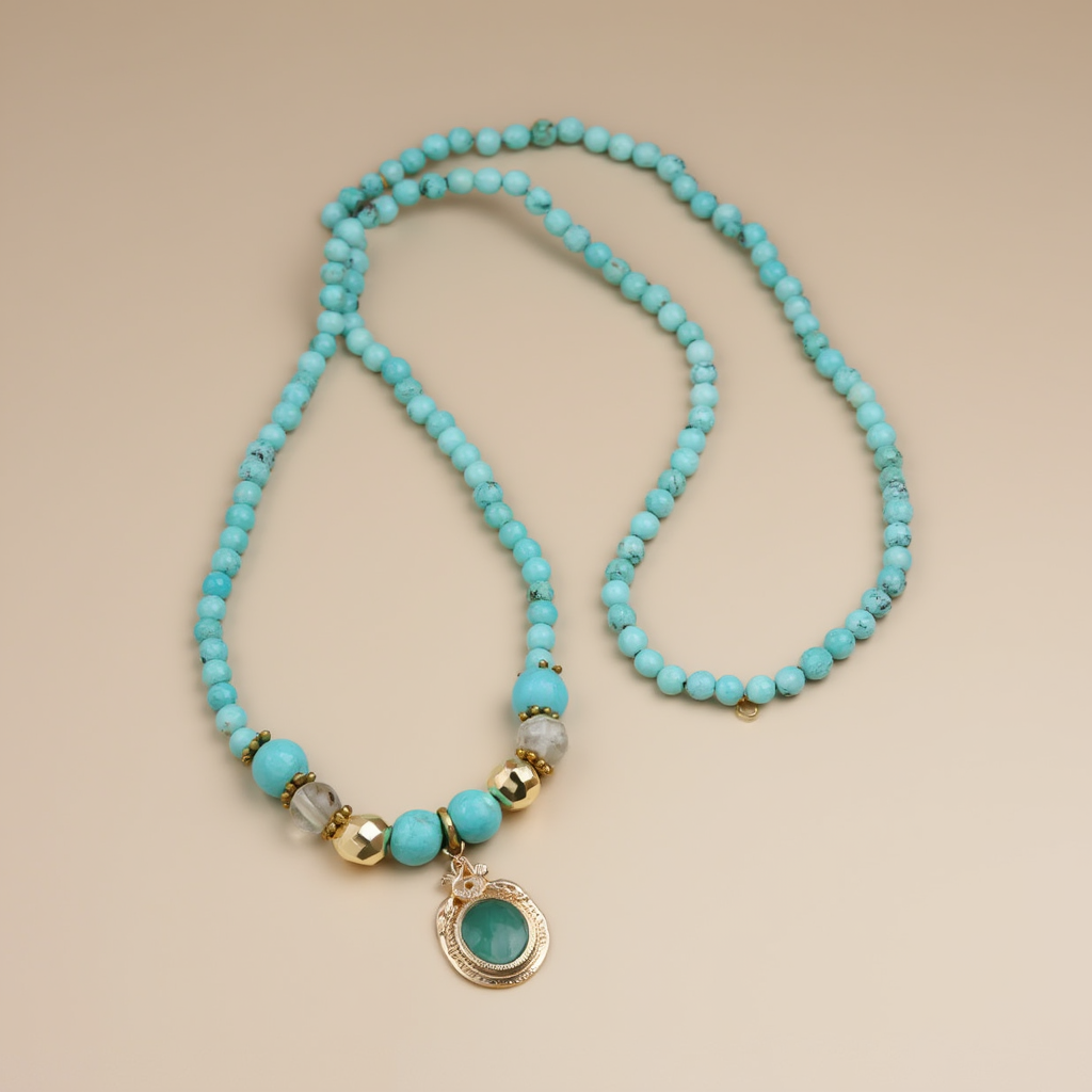 This turquoise boho necklace is a true tribute to the beauty of natural stones and the timeless elegance of design. The round blue stones add a touch of freshness and vitality to your outfit, attracting admiring glances. The turquoise pendant, with its distinctive blue-green hue, is beautifully framed by gold-plated metal, giving it a refined, chic allure.