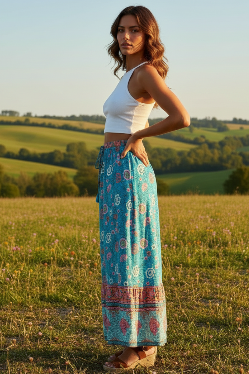 A romantic boho maxi skirt with a delicate floral print and border detail, made for effortless summer days