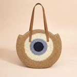This boho beach tote bag combines natural charm with a trendy bohemian design. Made from woven straw with a beautiful circular pattern and contrasting center detail, it adds an artistic and unique look to any outfit. The long faux leather handles allow you to carry it comfortably on the shoulder.