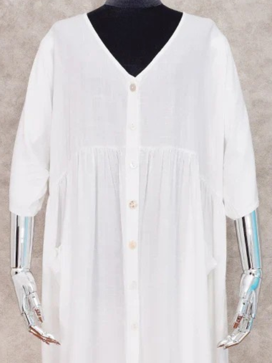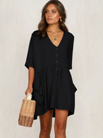 This versatile dress is perfect for any casual occasion, from a night out on the town to a day at the office. The flattering V-neck adds a touch of femininity to this shirt dress, highlighting your cleavage in a subtle, elegant way. The 3/4 sleeves provide light coverage while keeping you comfortable and at ease throughout the day. The flowing cut of this dress offers optimal comfort and total freedom of movement. Made from a soft, lightweight fabric, it envelops you with a pleasant feel against the skin, keeping you cool and comfortable even in warm weather. Versatile and easy to wear, this casual shirt dress is perfect for any occasion. Don't miss the opportunity to add this Beach Day Dress to your collection.