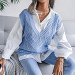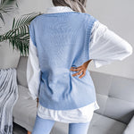 Stay Chic and Comfy with our Boho Blue Sleeveless V-Neck Knit Sweater - Perfect for Layering and Standalone Wear!