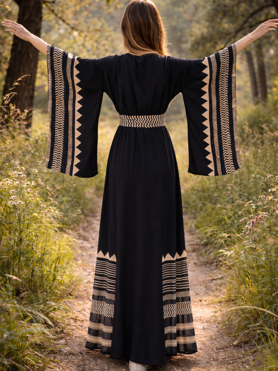 The Boho Aztec Kimono is designed for the modern woman who values both comfort and effortless elegance. Crafted from high-quality, lightweight fabric, it offers a soft feel and a graceful, flowing silhouette. Its bold geometric Aztec pattern on a deep black background adds a striking touch of originality and sophistication to any look.