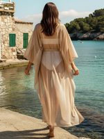 This piece combines the delicate sophistication of a sheer kimono dress with the fluid charm of flared sleeves and the comfortable fullness of a loose fit. Made from high-quality, lightweight materials, this kimono dress offers supreme comfort even on the hottest summer days. The dress's transparency adds a sultry, modern look, while the long flared sleeves and loose fit create a chic, casual look. With this dress, every day is an opportunity to show off your unique fashion sense. Let your style shine through with this exceptional piece!