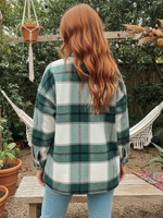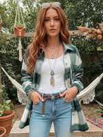 Stay cozy and chic with this relaxed fit plaid jacket inspired by bohemian style