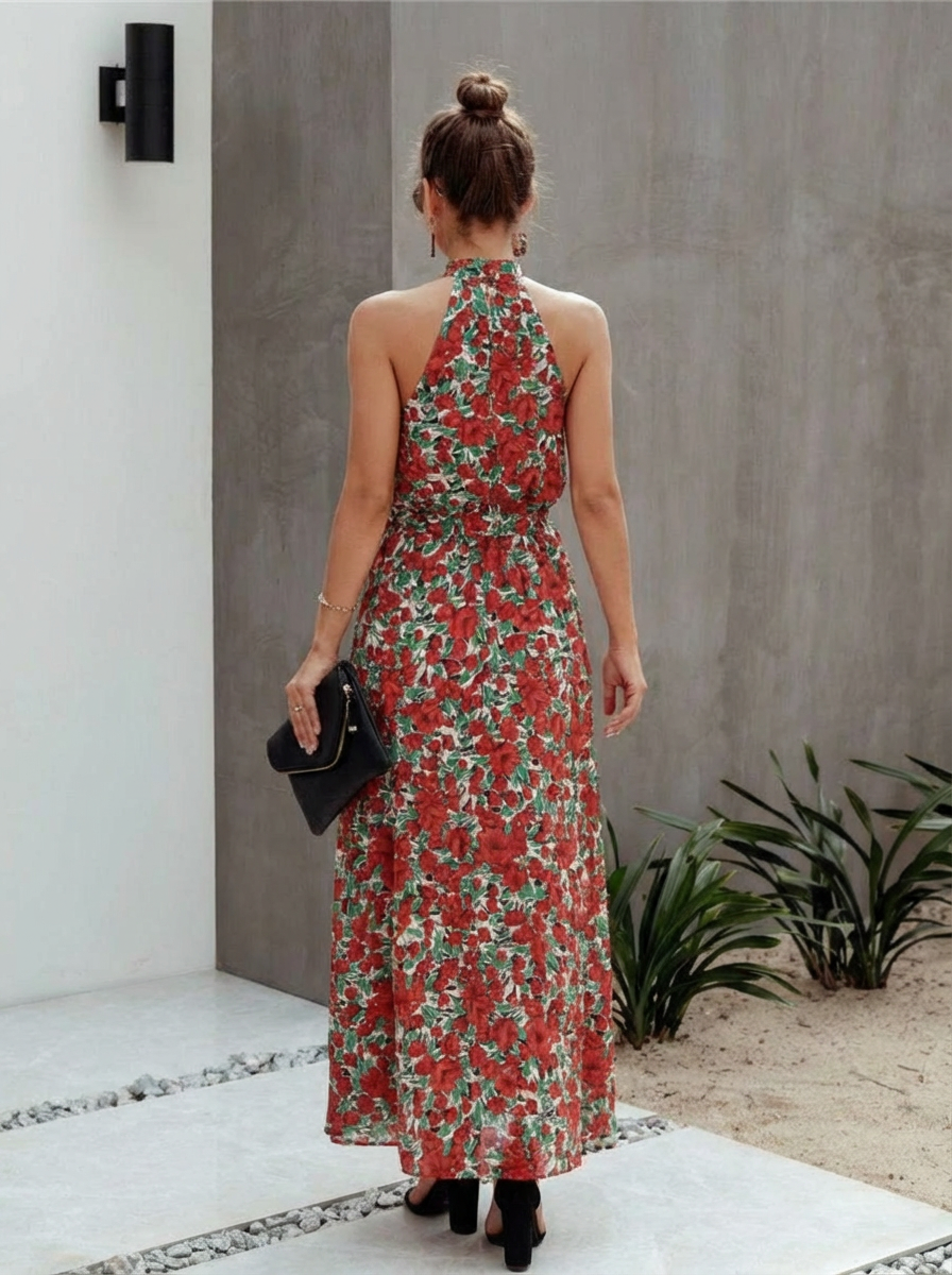 This dress is ideal for special occasions, summer evenings or even chic casual wear. Its red floral print adds a touch of color and playfulness to your look. The floral patterns are both classic and timeless, ensuring an elegant, feminine style. The stand-up collar adds a touch of elegance and creates a modern, sophisticated effect. It highlights your neck and adds a refined allure to the dress. The sleeveless bare shoulders add a subtle touch of sensuality and enhance your silhouette. Made from a lightweight, comfortable fabric, this dress will keep you comfortable throughout the day or evening. Complete your outfit with high-heeled sandals and matching accessories such as a clutch or delicate jewelry. You can also wear it more casually with flat sandals and a straw hat for a boho, summery look.