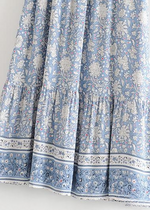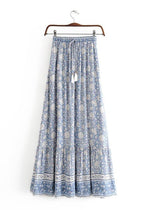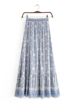 This Boho flared maxi skirt in blue with white floral pattern is a beautiful and elegant garment, perfect for any woman who loves to express her unique sense of style. The skirt is designed to be flowing and comfortable, with a loose fit and a long length that reaches down to the ankles. The main color of the skirt is a soft and serene blue, which gives it a soothing and peaceful look. The blue is complemented by a beautiful white floral pattern, with delicate flowers and leaves adding a feminine touch to the design. The skirt is flared and creates an elegant silhouette. It can be paired with a variety of tops, from a simple tank top to a more formal blouse, and can be accessorized with jewelry, belts and other fashion accessories to create a unique and personalized look.