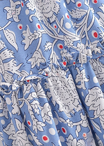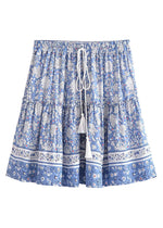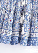 Description of the Boho mini wrap skirt, sky blue floral pattern with pompom