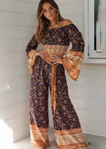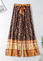 Description of the Boho Palazzo Pants in navy blue floral pattern, bow on the waist