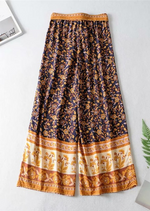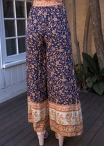 Boho Palazzo Pants in navy blue floral pattern, bow on the waist