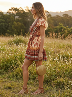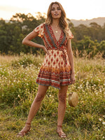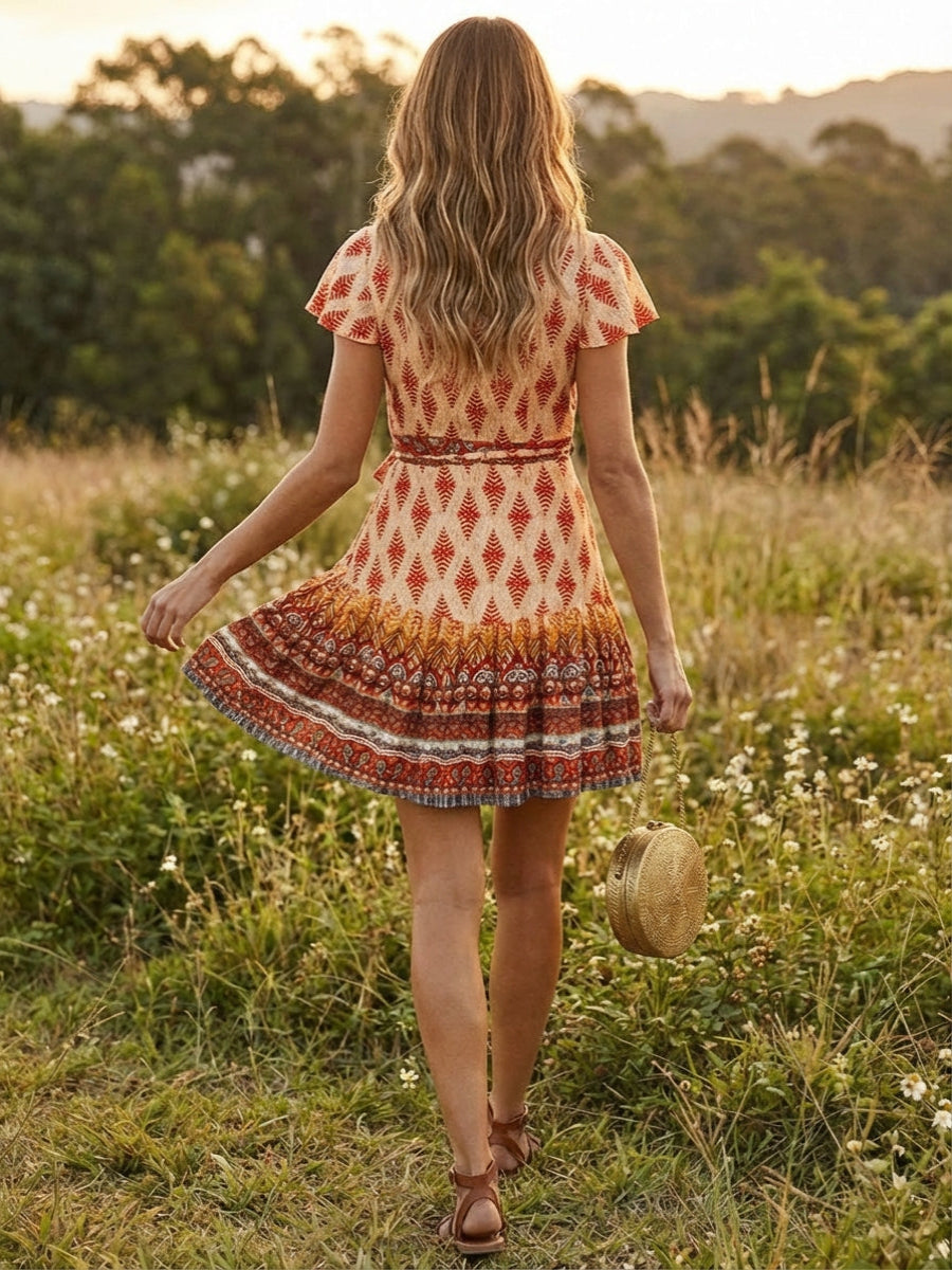 Its short and adjusted cut at the top, you assure to be radiant anytime and anywhere. Its vabriant warm colors will illuminate your skin complexion and your outfit to bring out you. This Boho wrap warm colors mini dress will fit perfectly into your Bohemian wardrobe.
