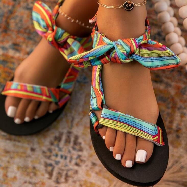 Introduce a pop of personality to your summer wardrobe with our Colorful Boho Flat Sandals featuring a charming bow