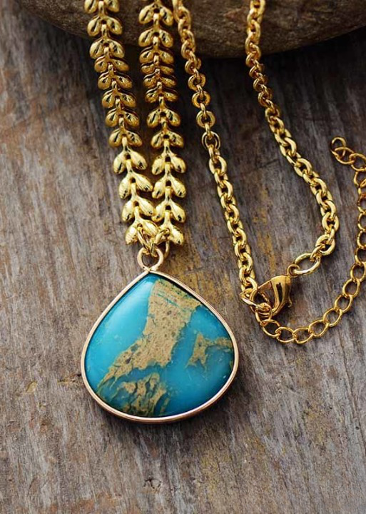 The delicate gold metal chain adds a touch of elegance and refinement to the ensemble, while the blue jasper stone catches the eye with its soothing hue and distinct oval shape. Jasper stone is renowned for its calming and balancing properties, making it a perfect choice for those seeking a touch of serenity in their outfit. The jasper stone pendant is carefully cut and polished to enhance its natural beauty. Its oval design gives it a modern, elegant look, while its subtle blue color lends a touch of softness and delicacy. This versatile necklace can be worn everyday or for special occasions. Add a touch of sophistication and charm to your look with this Elegant Boho Necklace Gold Chain.