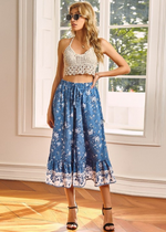 This floral midi skirt with slit and stretch waistband combines boho style elements with a feminine and elegant design. It is designed to be a fashionable and comfortable piece of clothing, perfect for a variety of occasions. It features a floral pattern that creates a classic and timeless look, with a midi length and split design that adds a touch of elegance and femininity. The stretchy waistband allows for a comfortable and adjustable fit. The midi length and slit design create an elegant and sophisticated look that is suitable for all kinds of occasions, from a formal event to a night out with friends. The skirt can be paired with heels or sandals and dressed up with a blouse or a t-shirt or tank top.