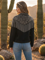 This oversized denim boho fringe jacket adds bold movement and effortless style to any outfit