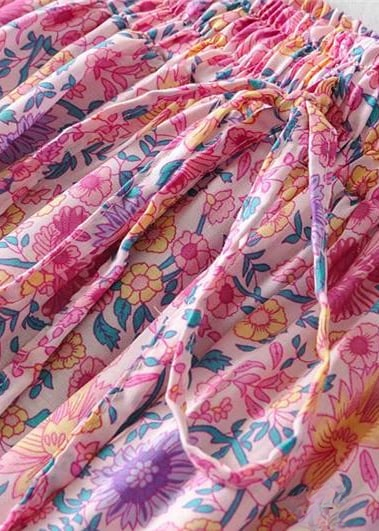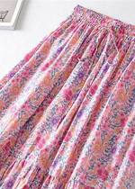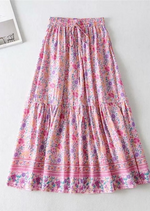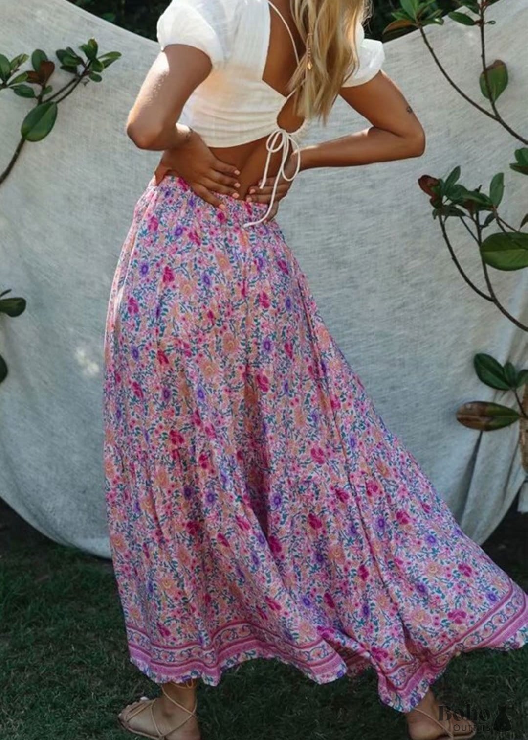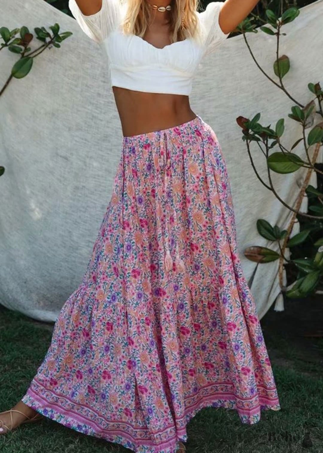 Description of the Pink boho ruffled maxi skirt with floral pattern