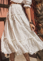 This white boho flared skirt with embroidered pattern is an elegant and feminine skirt, perfect for a boho-inspired look. The skirt is made from a lightweight, breathable fabric that drapes beautifully and offers a comfortable, relaxed fit. The skirt design includes a flared silhouette that creates movement and adds a feminine touch to the overall look. The embroidery pattern, adds a boho and playful touch to the skirt, creating a unique and eye-catching design. It is versatile and pairs well with different tops, from a simple t-shirt to a blouse. The flared, flowing design of the skirt is perfect for warm weather, offering a comfortable and airy fit. Overall, it's a must-have piece for anyone looking for a boho-inspired style.